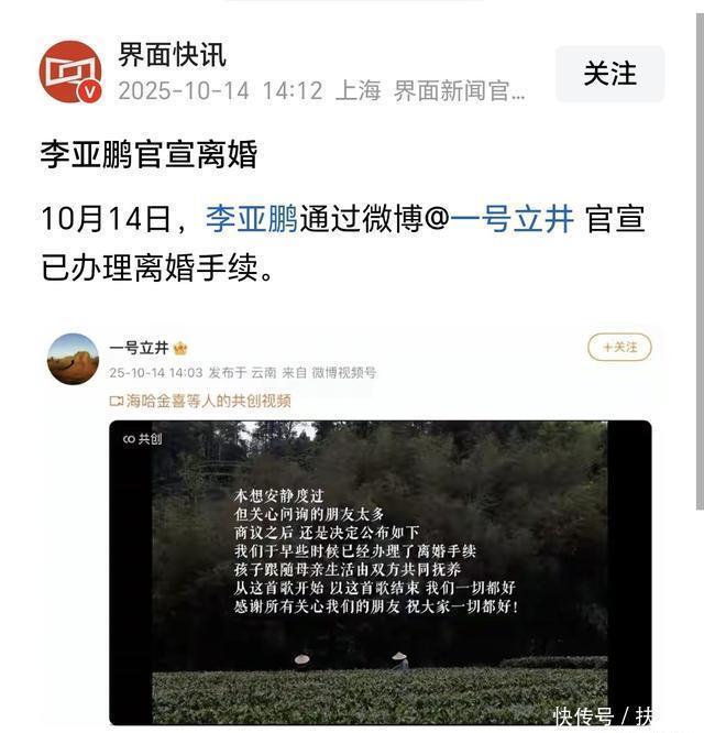 李亚鹏海哈金喜离婚:三年闪婚闪离,女儿监护权争议引热议。 今天网上突然刷到李亚鹏和海哈金喜离婚的消息,他们俩才结了三年婚就散了挺突然的。两个人下午发了声明,说和平分手,三岁女儿跟妈妈过,但俩人都会负责养孩子。看他们声明里没吵架争执,倒是比很多明星离婚好看多了。